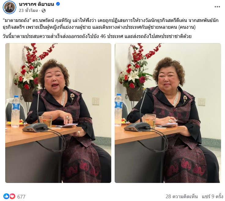 โดย ต๊ะ โพสต์ภาพ มาดามรถถัง พร้อมระบุว่า “มาดามรถถัง ดร.นพรัตน์ กุลหิรัญ เล่าให้ฟังว่า เคยถูกปฏิเสธการให้รางวัลนักธุรกิจสตรีดีเด่น จากสหพันธ์นักธุรกิจสตรีฯ