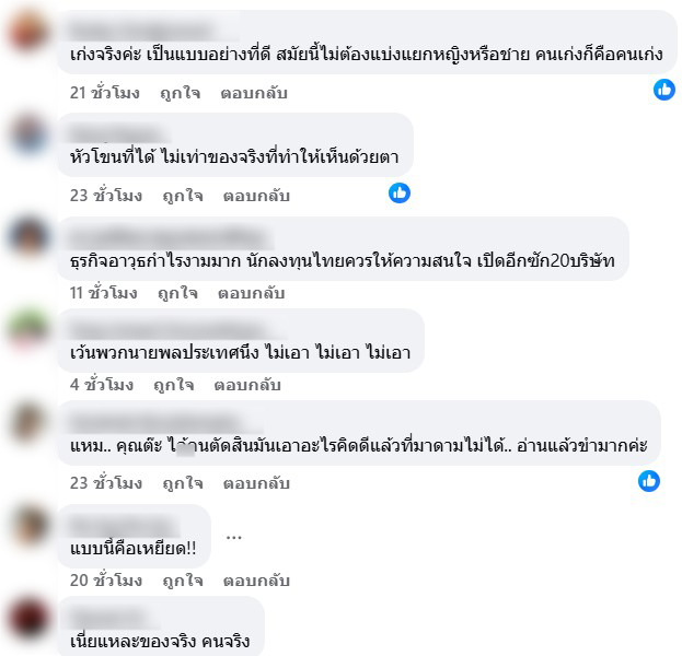 คอมเมนต์กันรัวๆเลยว่า เก่งจริงค่ะ เป็นแบบอย่างที่ดี สมัยนี้ไม่ต้องแบ่งแยกหญิงหรือชาย คนเก่งก็คือคนเก่ง , หัวโขนที่ได้ ไม่เท่าของจริงที่ทำให้เห็นด้วยตา , ธุรกิจอาวุธกำไรงามมาก นักลงทุนไทยควรให้ความสนใจ เปิดอีกซัก20บริษัท , เว้นพวกนายพลประเทศนึง ไม่เอา ไม่เอา ไม่เอา