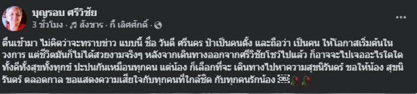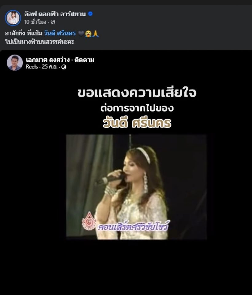 ขณะที่ อ๊อฟ ดอกฟ้า อาร์สยาม ก็ได้โพสต์ไว้อาลัยเช่นกัน พร้อมเล่าความทรงจำดี ๆ ที่เคยร่วมงานกันในวงศรีวิชัยโชว์ และขอให้วันดีเดินทางสู่ภพภูมิที่ดี