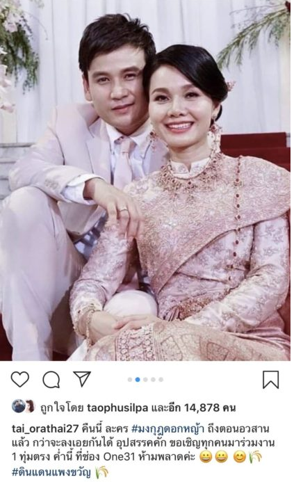 ซึ่ง ต่าย อรทัย ได้โพสต์แคปชั่นว่า “คืนนี้ละคร มงกุฎดอกหญ้า ถึงตอนอวสานแล้ว กว่าจะลงเอยกันได้ อุปสรรคคัก ขอเชิญทุกคนมาร่วมงาน 1 ทุ่มตรง ค่ำนี้ ที่ช่อง One31 ห้ามพลาดค่ะ