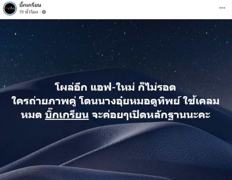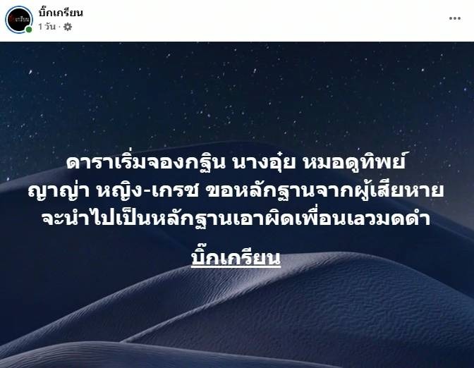 บิ๊กเกรียน จะค่อย ๆ เปิดหลักฐานนะคะ” และยังได้แนบแชตใต้โพสต์ นอกจากนี้ “เพจบิ๊กเกรียน” ยังโพสต์อีกว่า “ดาราเริ่มจองกฐิน นางอุ๋ย หมอดูทิพย์ ญาญ่า หญิง-เกรช ขอหลักฐานจากผู้เสียหายจะนำไปเป็นหลักฐานเอาผิดเพื่อนเaวมดดำ บิ๊กเกรียน” ต้องจับตาดูต่อไป ว่าเรื่องนี้จะจบลงอย่างไร
