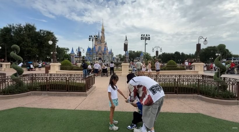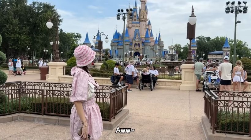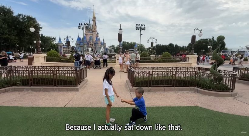 ด้วยน้ำเสียงแห่งความตื่นเต้นปนเขิน เพราะการมาที่นี่ครั้งนี้เป็นการมากันทั้งครอบครัว 4 คน พ่อแม่ลูก ไม่ใช่การมากันแค่ 2 คนกับแก๊งเพื่อนๆ เหมือนที่เคยมา ก่อนจะชวนเด็กๆ มาถ่ายรูปหน้าปราสาท ซึ่ง ป๊อก และ มาร์กี้ โพสท่าเดิมเหมือนเมื่อครั้งตอนคุกเข่าขอแต่งงาน